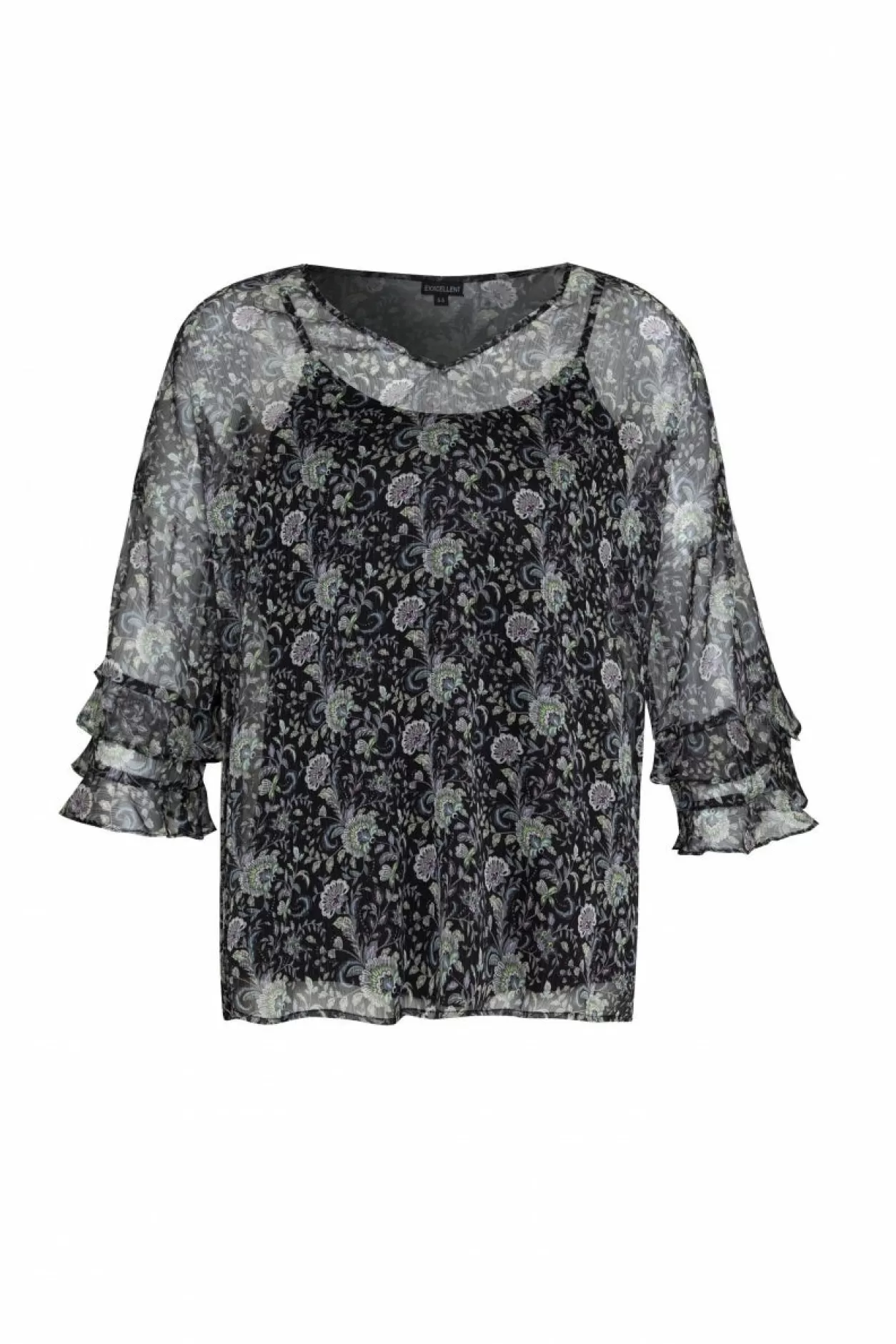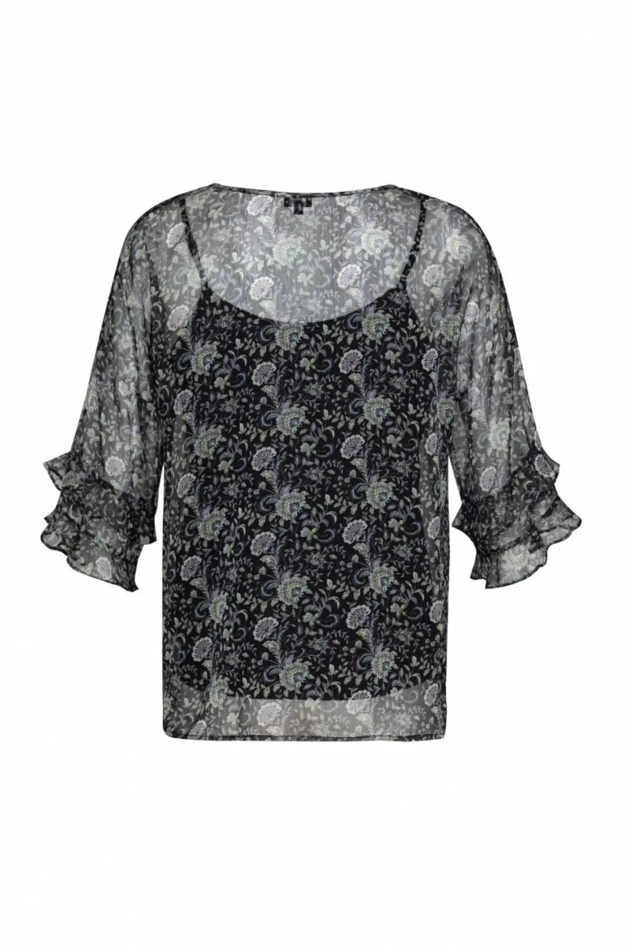 Geef Je Look Een Speelse Touch Met De Roos Top, Dat Voorzien Is Van Een Subtiele Floral Dessin Verwerkt Op Mesh-Materiaal. De Top Heeft Een Losvallend Model Met Geruffelde, Halflange Mouwen En Een V-Hals. Deze Top Is Voorzien Van Een Zwart Singlet Om Er Onder Te Dragen.