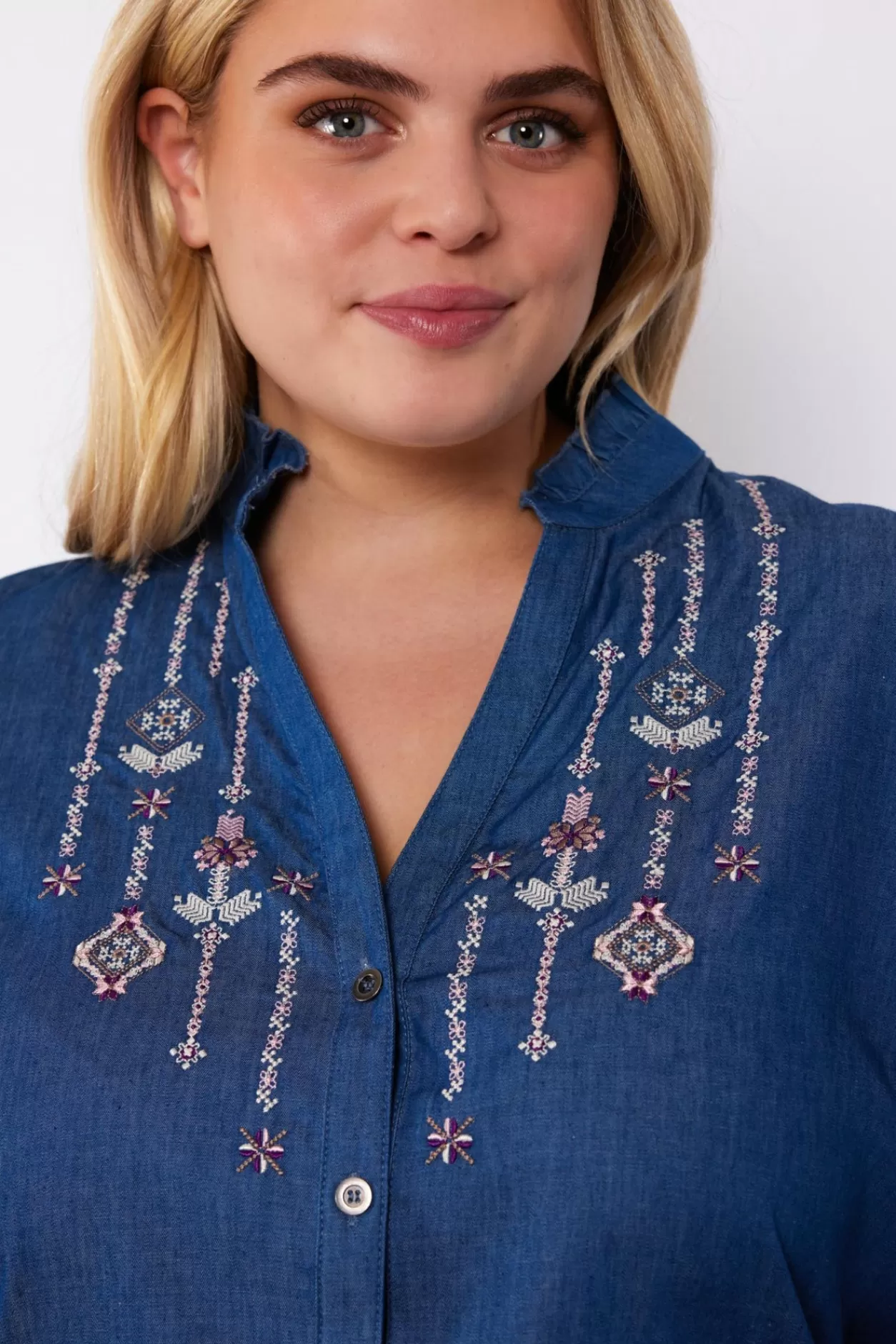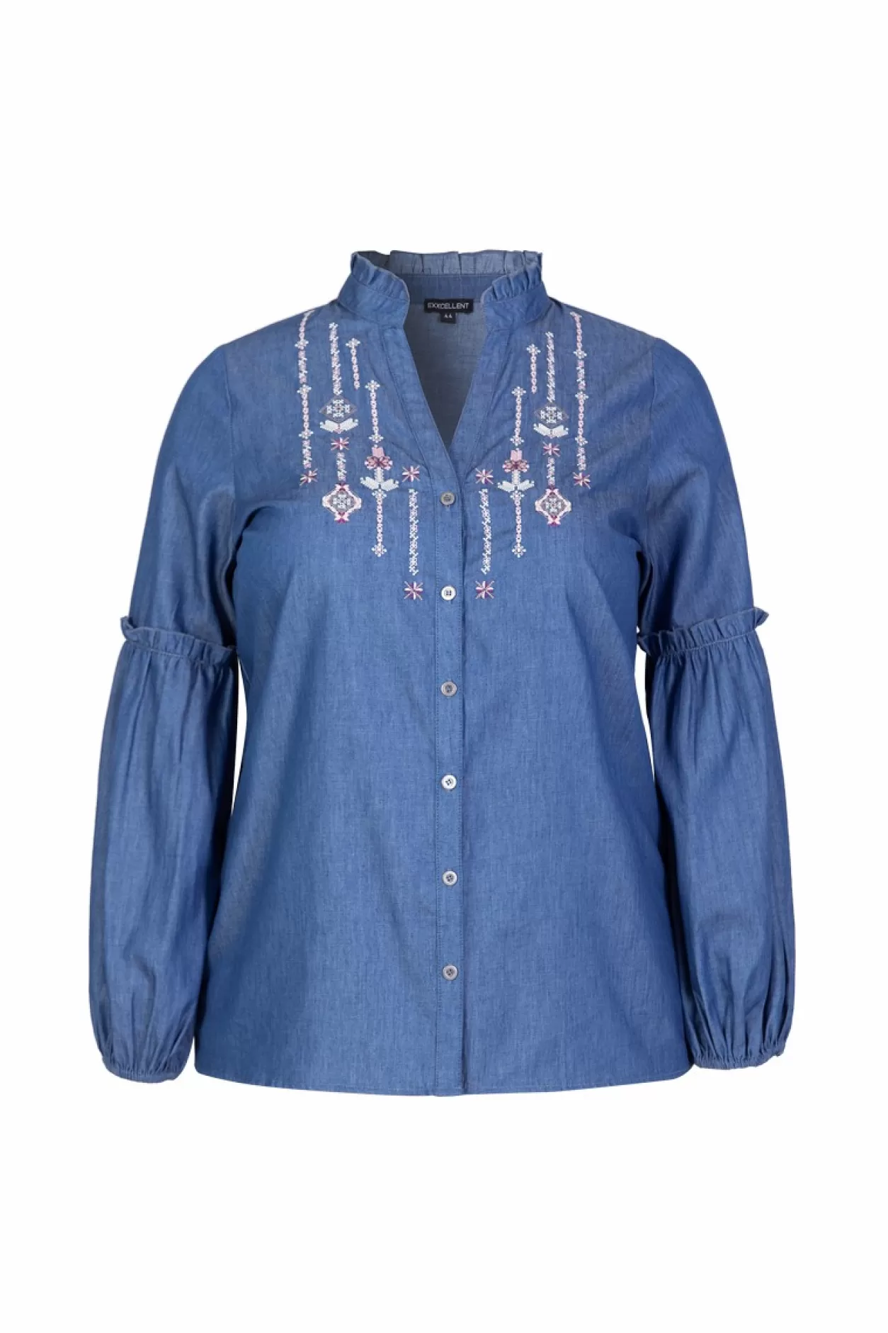Dompel Jezelf Onder In Casual Chic Met Onze Ginny Blouse, Een Verfijnd Stuk Met Een Subtiele Denim Look En Prachtige Geborduurde Details Rond De Hals. Deze Blouse Biedt De Perfecte Balans Tussen Moeiteloze Elegantie En Eigentijdse Stijl.