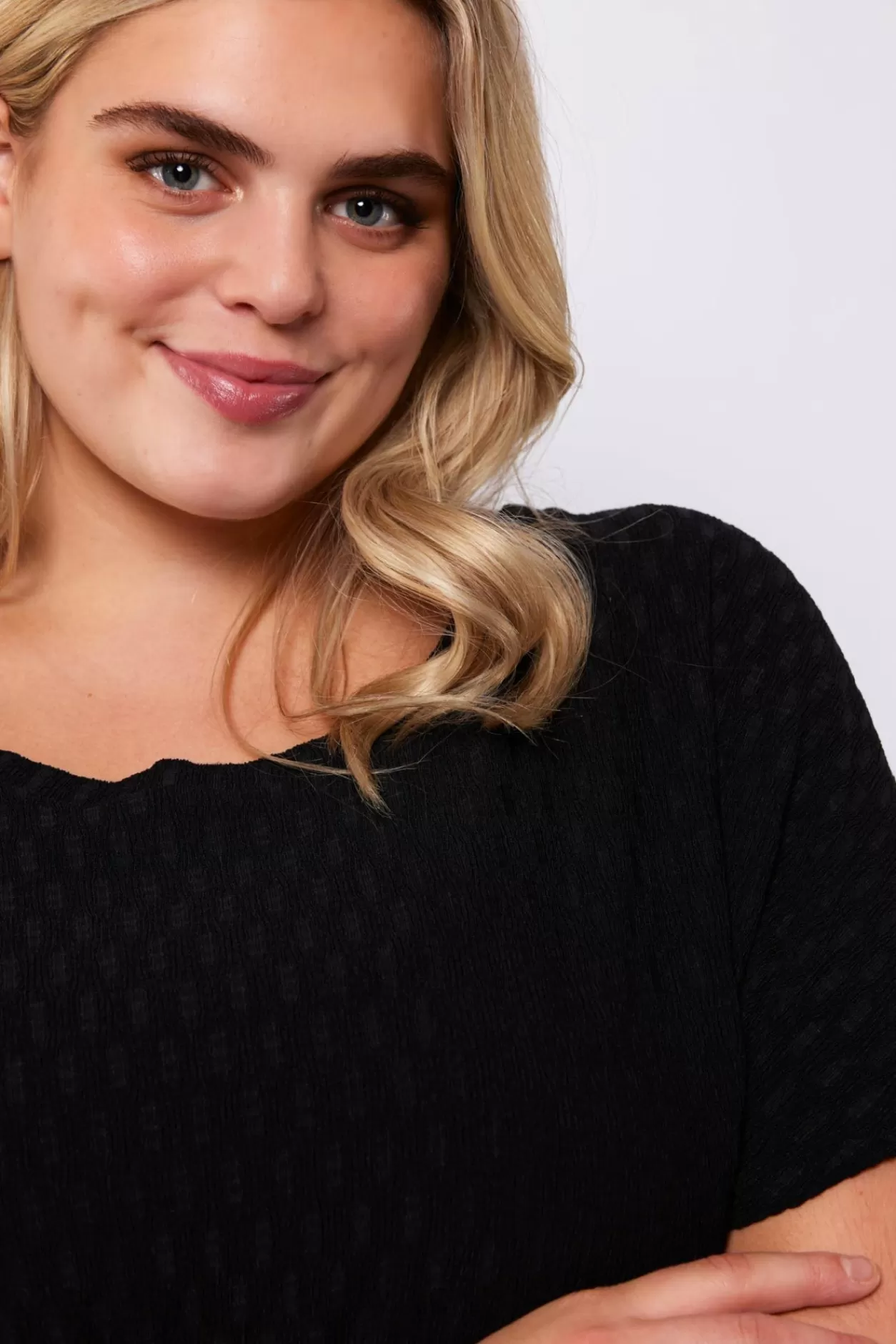 De Korte Mouwen En Het Unieke Koorddetail Aan De Onderkant Voegen Een Eigentijdse Touch Toe, Terwijl Het Subtiele Motief Een Charmante Uitstraling Geeft. Laat Jezelf Zien In De Aafke Top En Omarm Moeiteloos De Casual Chic Look Deze Lente.