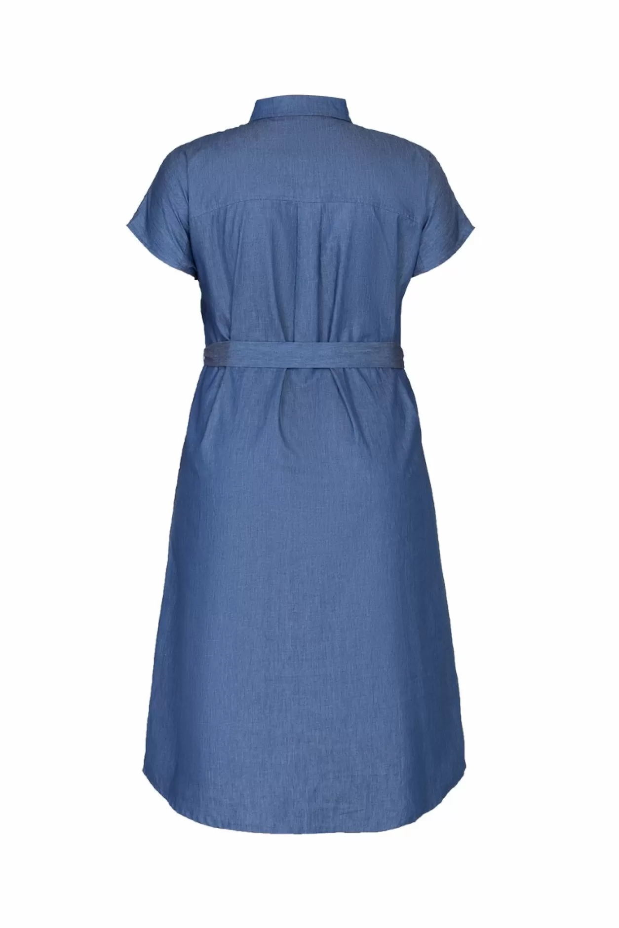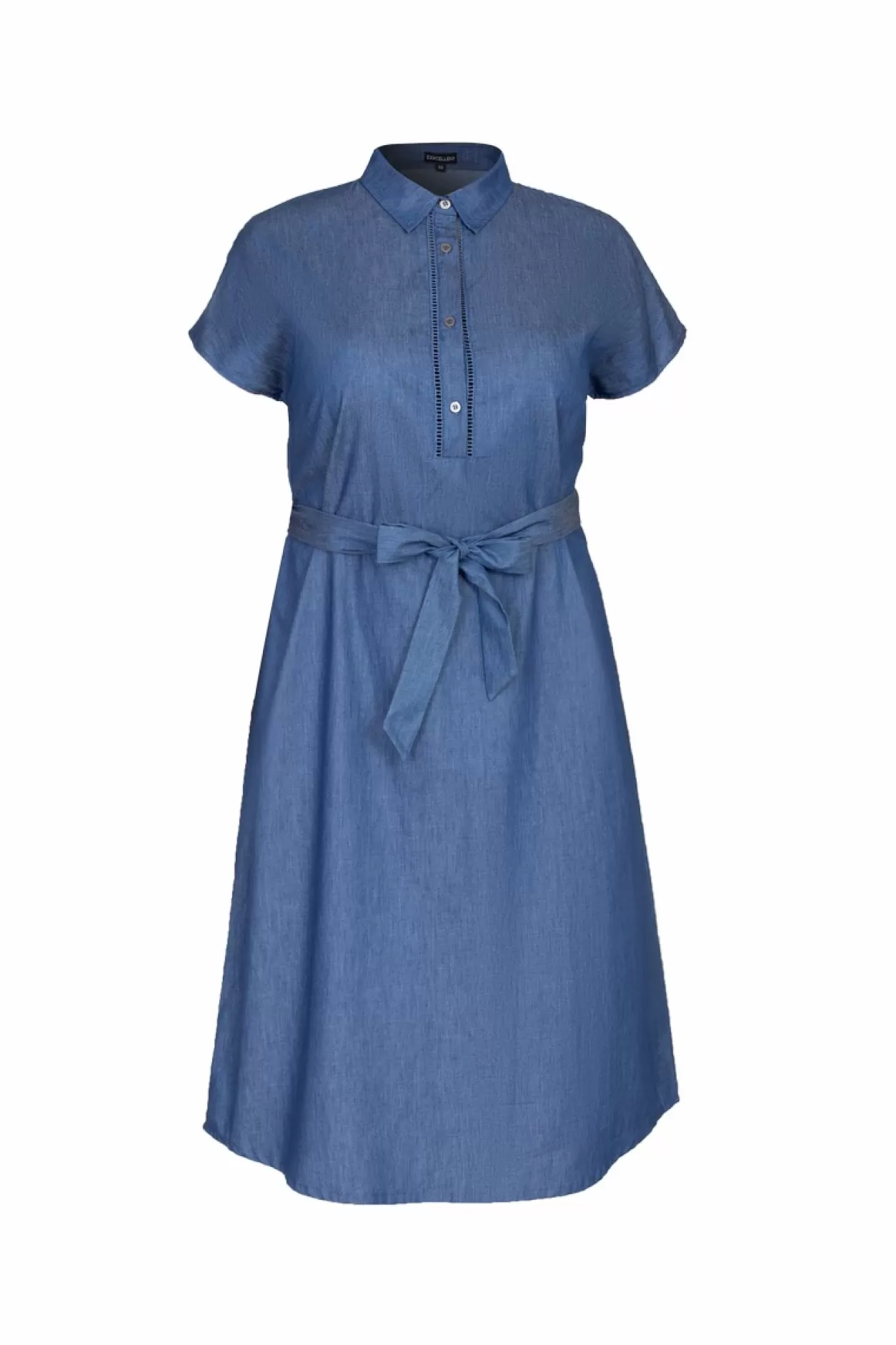 De Jess Jurk Heeft Een Elegante Denim Look. De Stijlvolle Jurk Heeft Korte Mouwen, Straalt Klasse Uit, Valt Elegant Over De Knieën En Is Verfraaid Met Een Subtiele Strikceintuur.