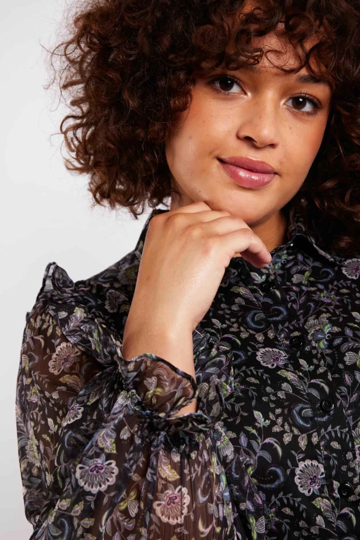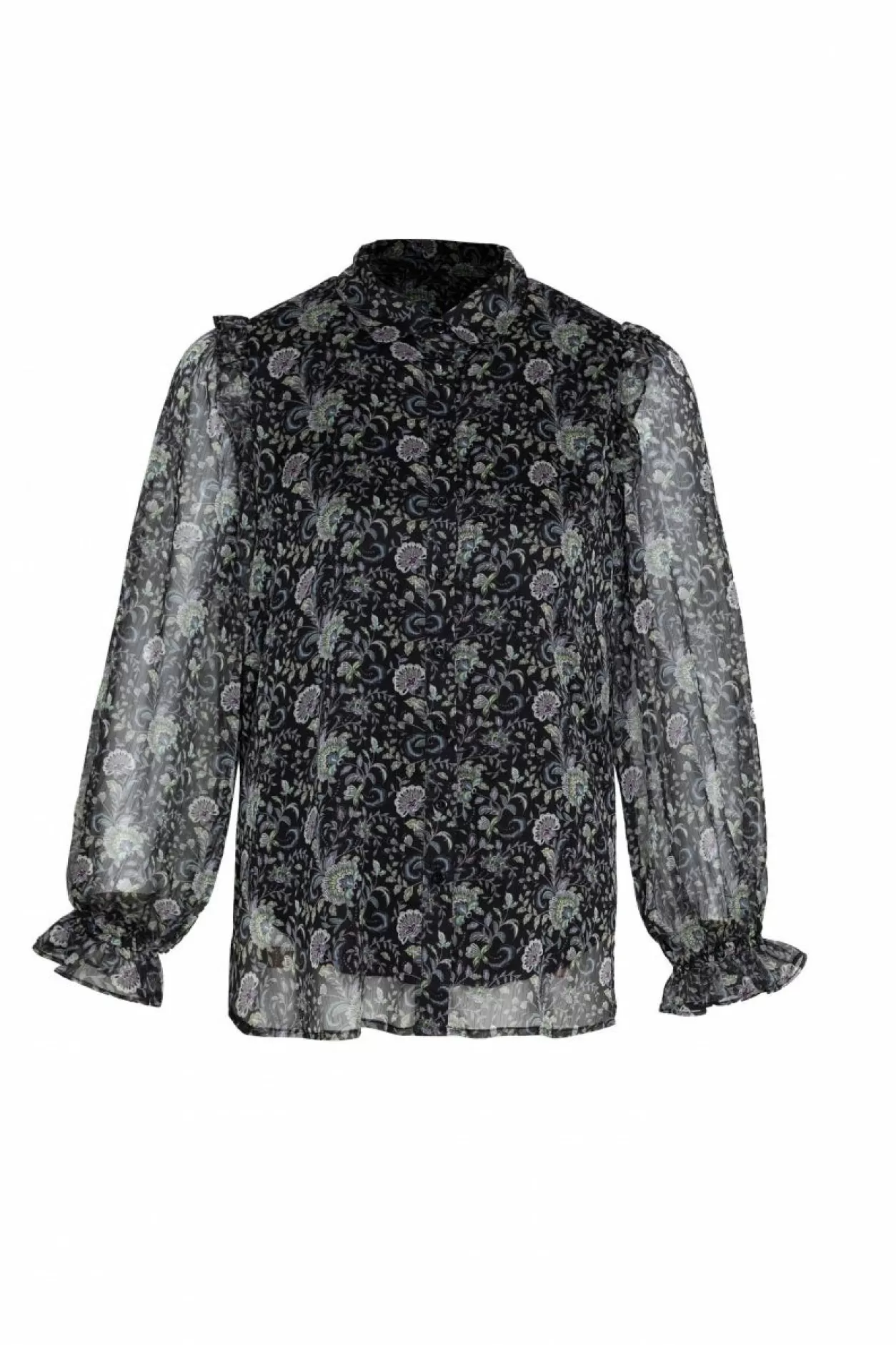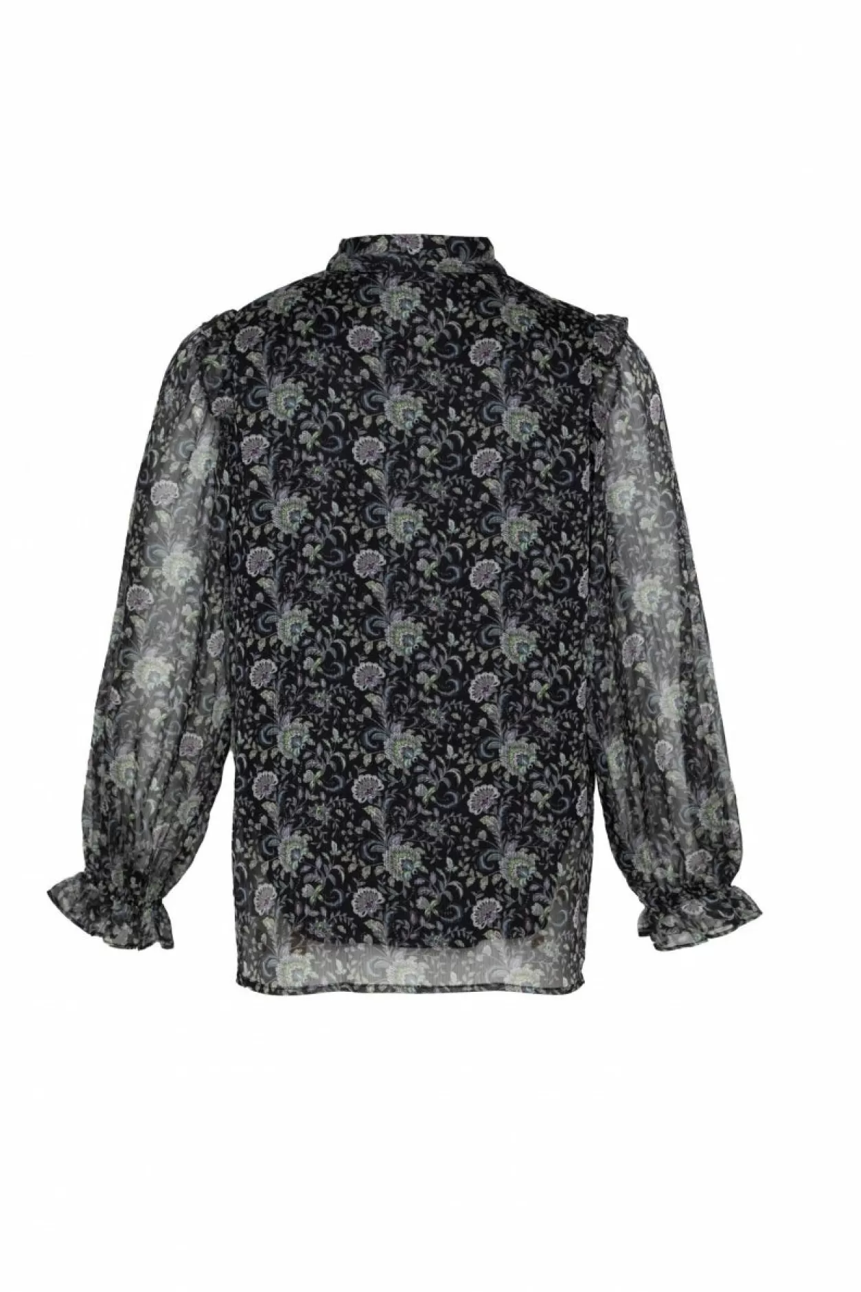 Ga Dit Najaar Voor Een Chique Look Met De Rosa Blouse. Deze Blouse Is Namelijk Voorzien Van Een Subtiele Floral Dessin Verwerkt Op Mesh-Materiaal, Met Ruffles Op De Schouders En De Uiteinden Van De Mouwen.