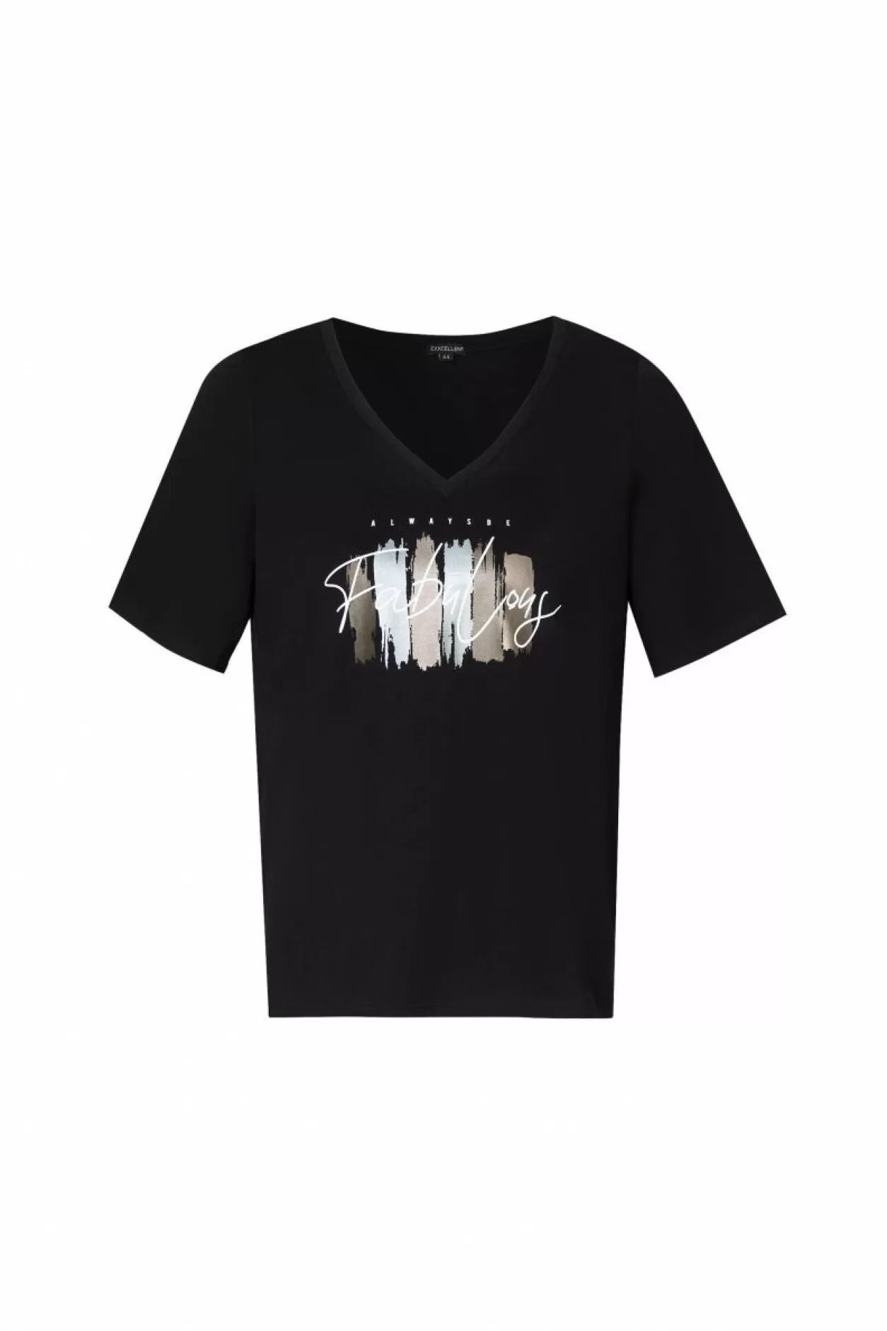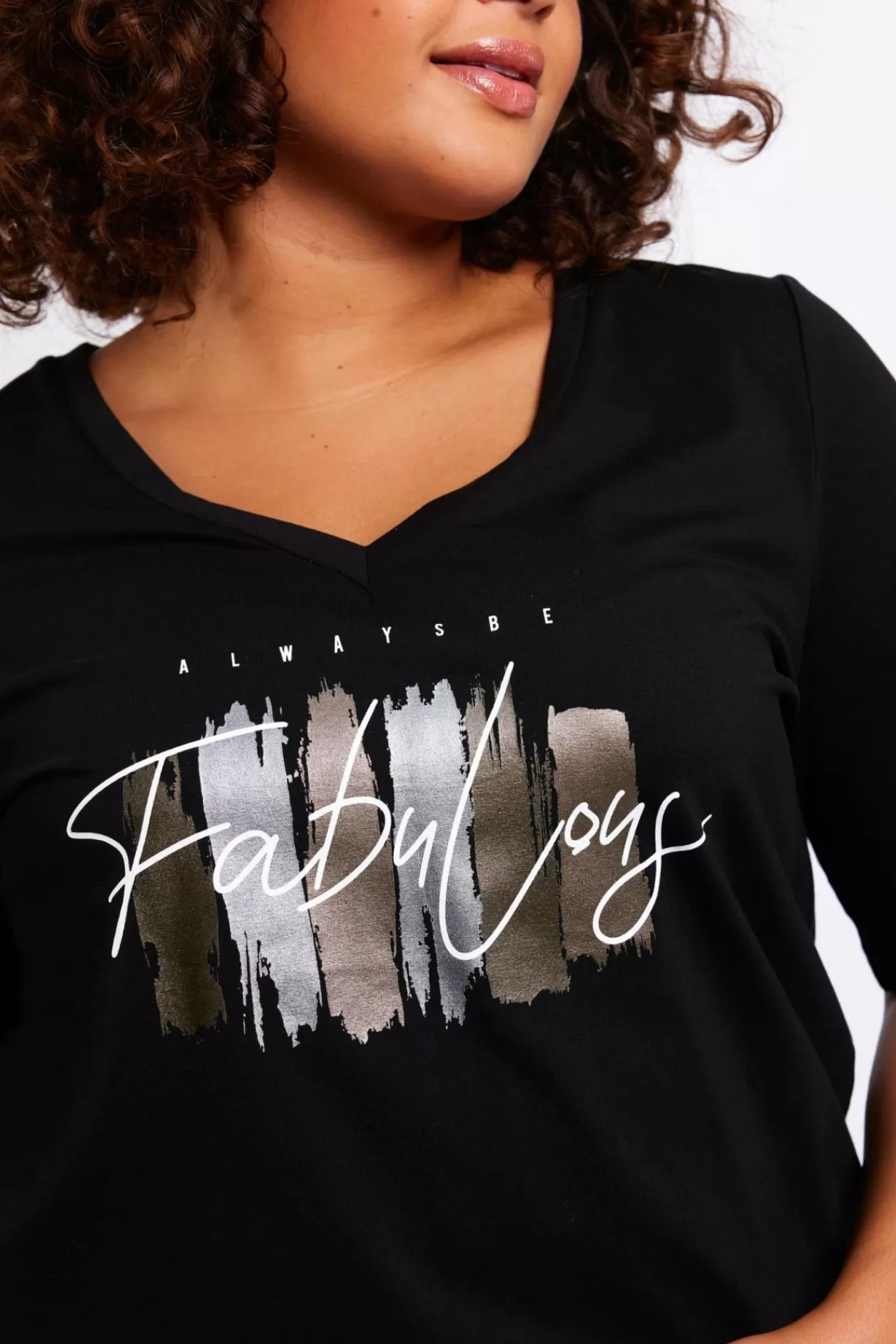 Omarm Moeiteloze Stijl Met Ons Zwarte Marja T-Shirt Met Korte Mouwen, Verrijkt Door Een Pakkende Grafische Opdruk: “Always Be Fabulous”. Een Krachtige Herinnering Om Altijd Jezelf Te Zijn En Te Stralen In Elke Situatie.Model Is 173 Cm En Draagt Een Maat 44.