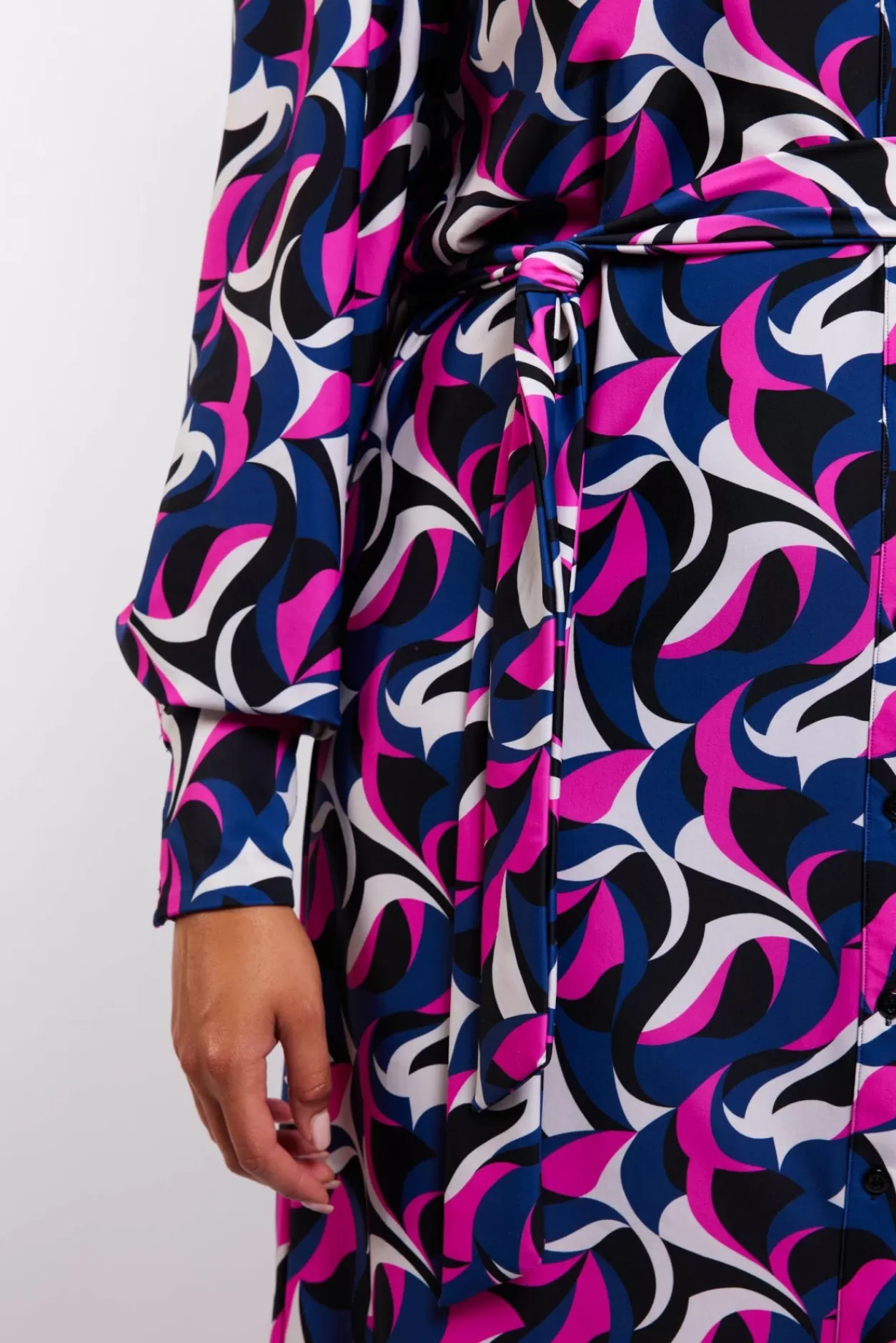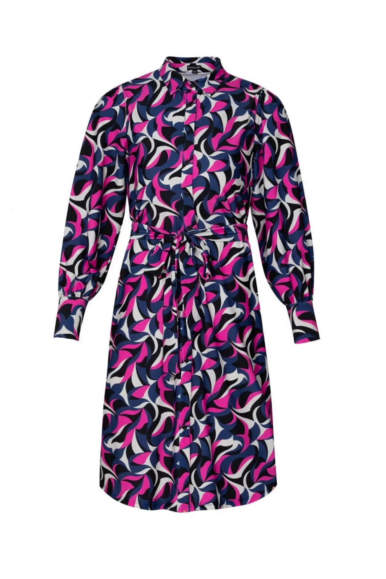 Laat De Magie Van De Winter Tot Leven Komen In Onze Thirza Jurk Met Abstracte Print, Elegant Geaccentueerd Door Het Ceintuur Om De Taille En Klassieke Kraag. Een Harmonie Van Stijl En Elegantie, Perfect Om Je Te Hullen In Luxe Tijdens De Koude, Maar Feestelijke Maanden. Model Is 173 Cm En Draagt Een Maat 44.